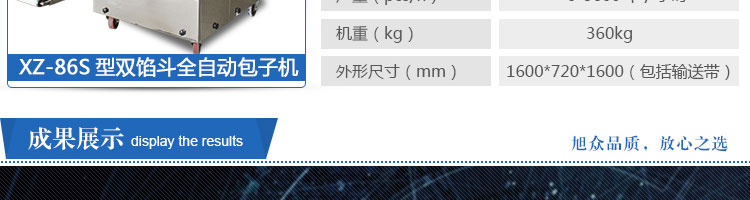 XZ-86S型雙餡斗全自動(dòng)包子機(jī),可生產(chǎn)各種肉包、肉菜包、菜包、小籠包、湯包、水晶包、圓饅頭、奶黃包、豆沙包、叉燒包、南瓜餅等幾十種包餡制品。適用于賓館、飯店、學(xué)校、機(jī)關(guān)企業(yè)食堂、饅頭或包子加工廠、早餐工程店及速凍食品廠等單位??蓾M足不同客戶群體。免費(fèi)提供工藝技術(shù)。免費(fèi)上門培訓(xùn)指導(dǎo)安裝。