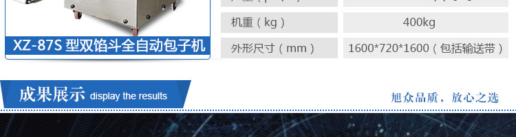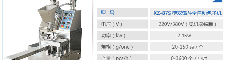 XZ-87S型雙餡斗全自動包子機,可生產(chǎn)各種肉包、肉菜包、菜包、小籠包、湯包、水晶包、圓饅頭、奶黃包、豆沙包、叉燒包、南瓜餅等幾十種包餡制品。適用于賓館、飯店、學校、機關企業(yè)食堂、饅頭或包子加工廠、早餐工程店及速凍食品廠等單位??蓾M足不同客戶群體。免費提供工藝技術(shù)。免費上門培訓指導安裝。