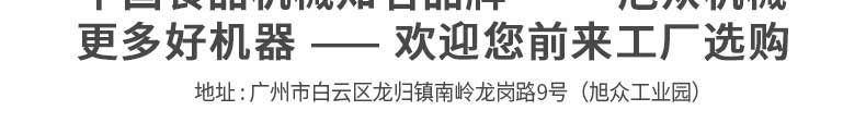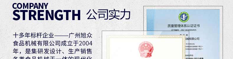 廣州旭眾食品機械有限公司是一家集科研開發(fā),生產(chǎn)設(shè)計,營銷服務(wù)為一體的現(xiàn)代化生產(chǎn)企業(yè)?,F(xiàn)代化生產(chǎn)車間,精湛制造技術(shù),所產(chǎn)機械歷經(jīng)市場重重考驗,不斷贏得海內(nèi)外客戶的贊譽。