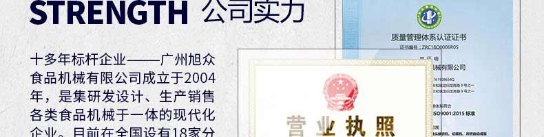 廣州旭眾食品機械有限公司是一家集科研開發(fā),生產(chǎn)設(shè)計,營銷服務(wù)為一體的現(xiàn)代化生產(chǎn)企業(yè)。現(xiàn)代化生產(chǎn)車間,精湛制造技術(shù),所產(chǎn)機械歷經(jīng)市場重重考驗,不斷贏得海內(nèi)外客戶的贊譽。