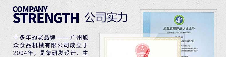 廣州旭眾食品機(jī)械有限公司是一家集科研開發(fā),生產(chǎn)設(shè)計(jì),營(yíng)銷服務(wù)為一體的現(xiàn)代化生產(chǎn)企業(yè)。現(xiàn)代化生產(chǎn)車間,精湛制造技術(shù),所產(chǎn)機(jī)械歷經(jīng)市場(chǎng)重重考驗(yàn),不斷贏得海內(nèi)外客戶的贊譽(yù)。