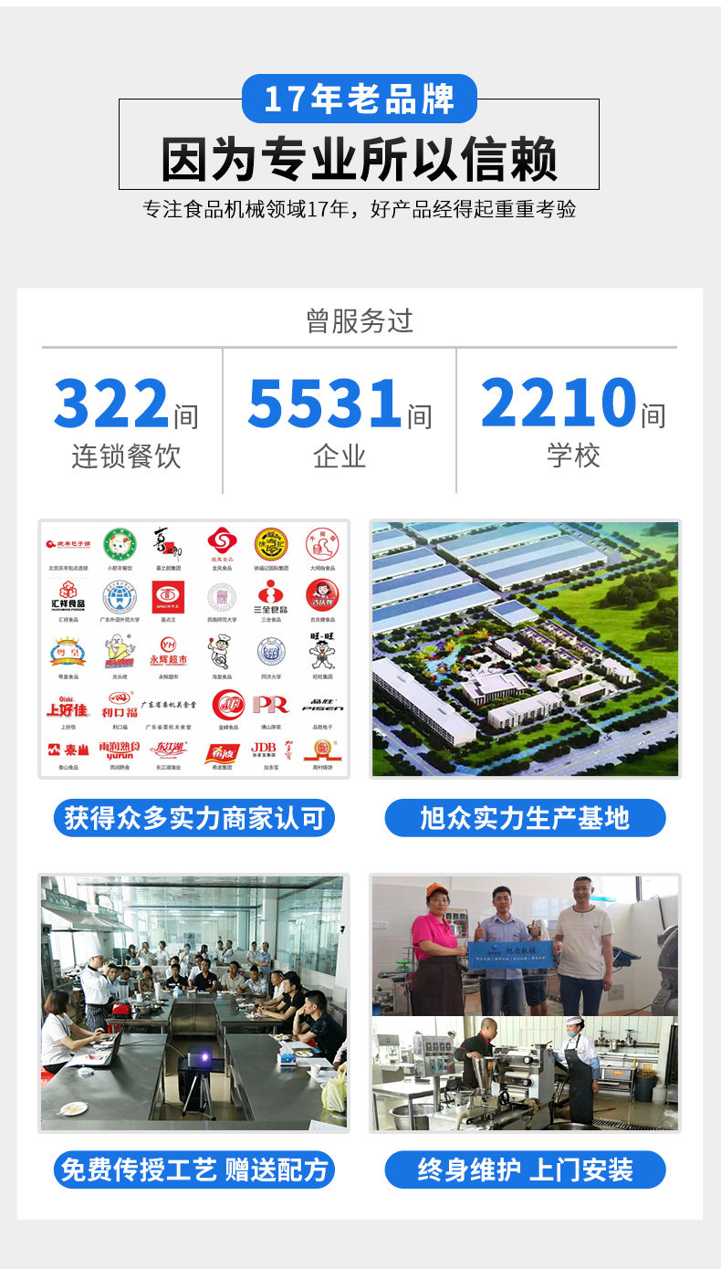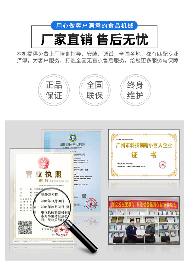 廣州旭眾食品機(jī)械有限公司是一家集科研開發(fā),生產(chǎn)設(shè)計,營銷服務(wù)為一體的現(xiàn)代化生產(chǎn)企業(yè)?,F(xiàn)代化生產(chǎn)車間,精湛制造技術(shù),所產(chǎn)機(jī)械歷經(jīng)市場重重考驗(yàn),不斷贏得海內(nèi)外客戶的贊譽(yù)。