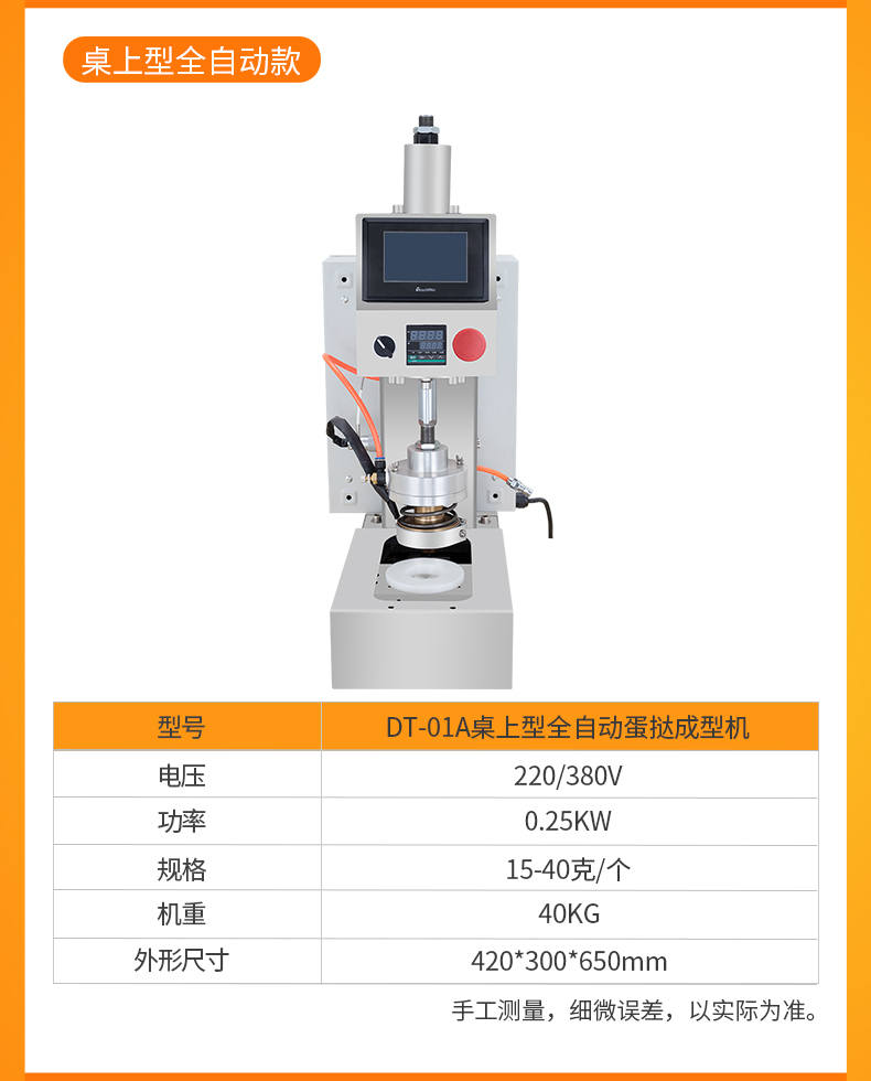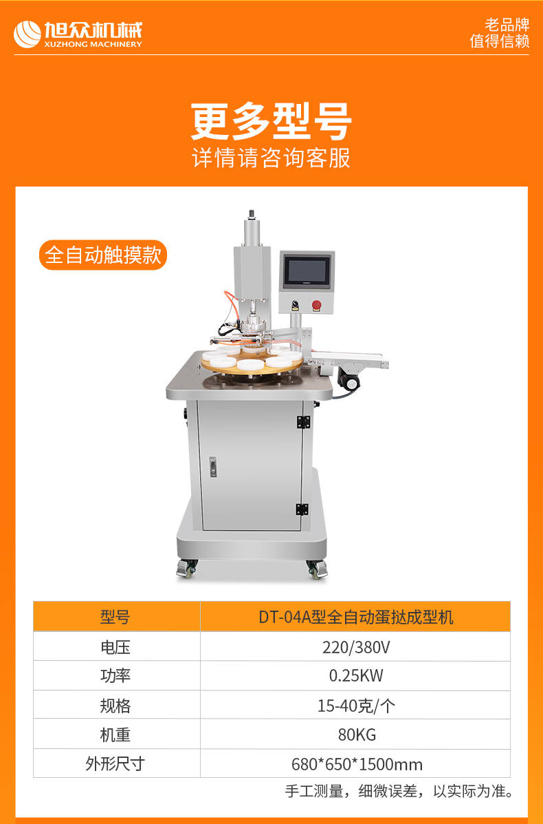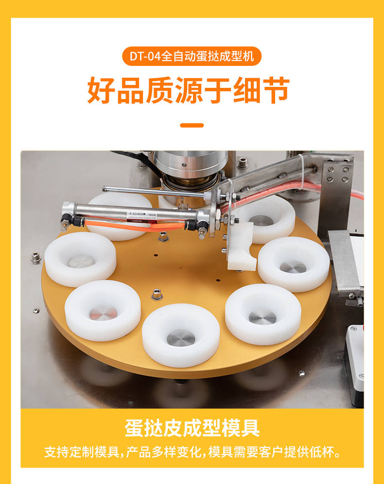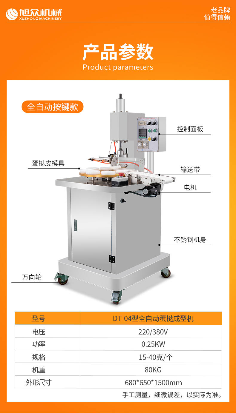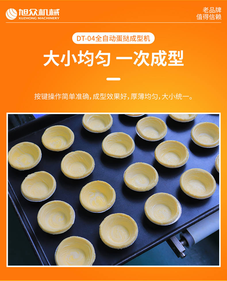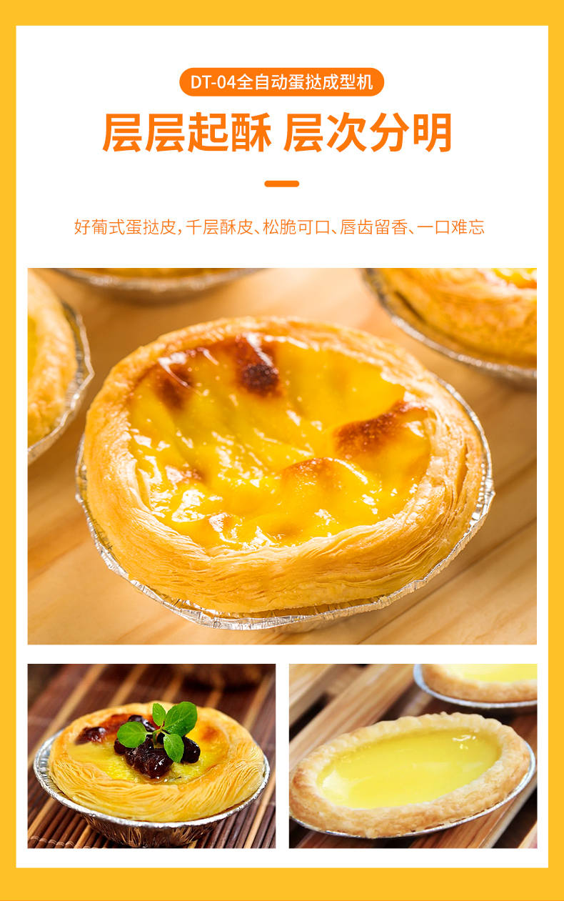 DT-04全自動蛋撻成型機,2-3秒快速成型。該機應用于傳統(tǒng)蛋撻、葡式蛋撻及其它須印型之產(chǎn)品突破傳統(tǒng)用手捏,采用微電子控制成型,一個2-3秒,高效率。大小均勻一次成型按鍵操作簡單準確,成型效果好,厚薄均勻,大小統(tǒng)-。層層起酥層次分明好葡式蛋撻皮,千層酥皮、松脆可口、唇齒留香、一口難忘。
