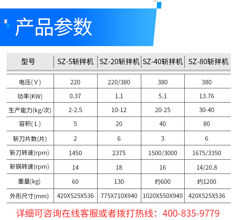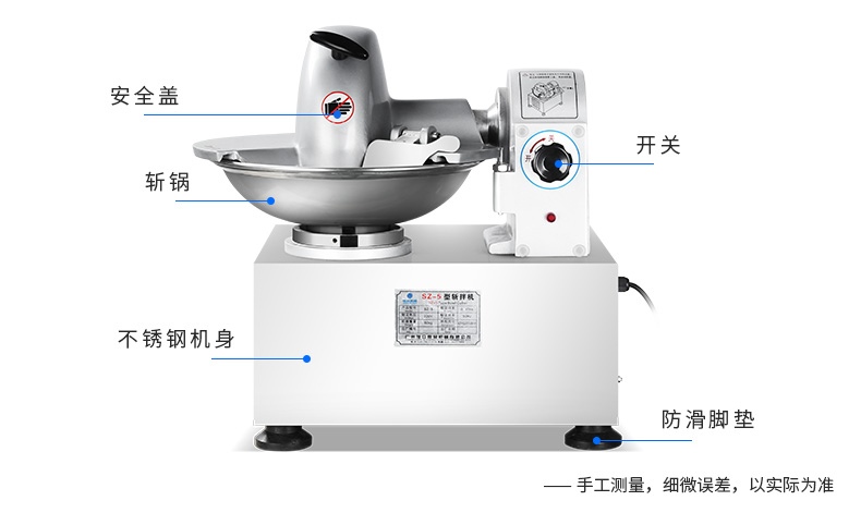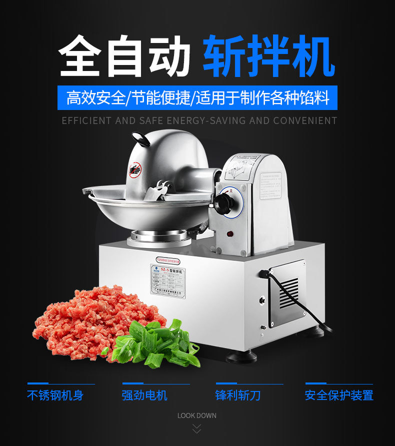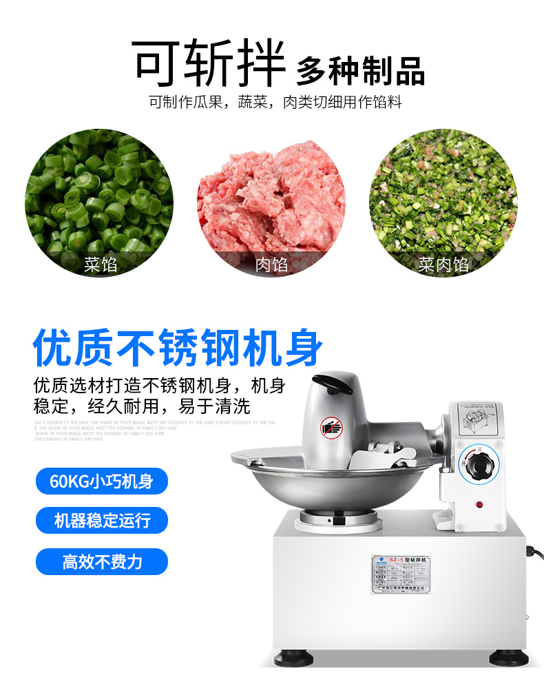 SZ-5型斬拌機,全自動斬拌機,高效安全、節(jié)能便捷、適用于制作各種餡料??蓴匕瓒喾N制品,可制作瓜果,蔬菜,肉類切細用作餡料。優(yōu)質(zhì)選材打造不銹鋼機身,機身穩(wěn)定,經(jīng)久耐用,易于清洗。