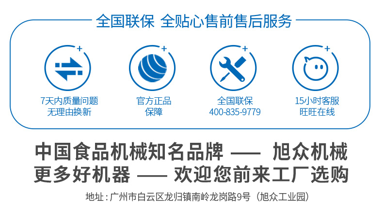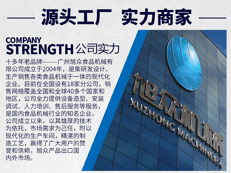 廣州旭眾食品機械有限公司是一家集科研開發(fā),生產(chǎn)設(shè)計,營銷服務(wù)為一體的現(xiàn)代化生產(chǎn)企業(yè)?,F(xiàn)代化生產(chǎn)車間,精湛制造技術(shù),所產(chǎn)機械歷經(jīng)市場重重考驗,不斷贏得海內(nèi)外客戶的贊譽。