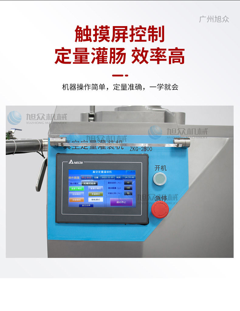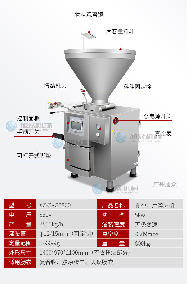XZ-ZKG2800真空灌腸機,真空葉片灌裝機連續(xù)作業(yè)加料后不需停機,可灌肉粒&肉糜實用性強灌各種腸可做烤腸、親親腸、廣式臘腸、火鍋腸等連續(xù)灌制長腸。