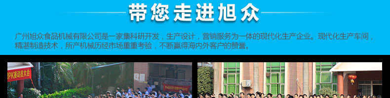 廣州旭眾食品機(jī)械有限公司是一家集科研開發(fā),生產(chǎn)設(shè)計,營銷服務(wù)為一體的現(xiàn)代化生產(chǎn)企業(yè)。現(xiàn)代化生產(chǎn)車間,精湛制造技術(shù),所產(chǎn)機(jī)械歷經(jīng)市場重重考驗(yàn),不斷贏得海內(nèi)外客戶的贊譽(yù)。