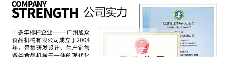廣州旭眾食品機(jī)械有限公司是一家集科研開發(fā),生產(chǎn)設(shè)計,營銷服務(wù)為一體的現(xiàn)代化生產(chǎn)企業(yè)?,F(xiàn)代化生產(chǎn)車間,精湛制造技術(shù),所產(chǎn)機(jī)械歷經(jīng)市場重重考驗,不斷贏得海內(nèi)外客戶的贊譽。