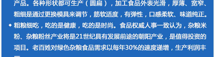 SZ-350多功能米粉機(jī),生產(chǎn)多樣性可生產(chǎn)米粉、米線、粉絲、粉條、、年糕、玉米面條、各種雜糧粉絲、各種面條、雜糧面條、彩色面條以及以紅薯、玉米、大豆、蠶豆等制成淀粉為原料的等多種食品而且每種食品厚薄、粗細(xì)等規(guī)格可根據(jù)需要任意調(diào)整。