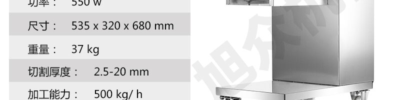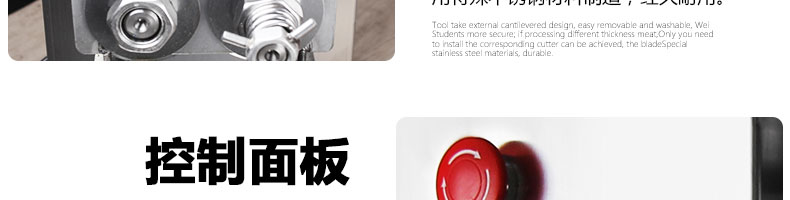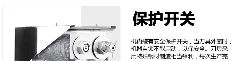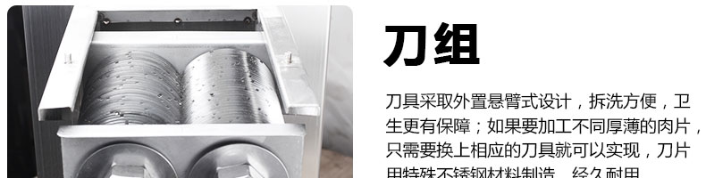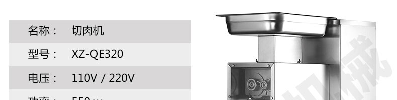 XZ-QE切肉機,是一款可方便移動的肉類加工設備,配置單層刀具一次性切肉片,二次切肉絲,再切成粒。底座設置有滑輪,移動靈活,輕松便捷;刀具采取外置懸臂式設計,拆洗方便,衛(wèi)生更有保障;配置多種刀具,可加工不同厚度的肉片,實現一機多用;機內裝有安全保護開頭,刀具外露時,機器自鎖不能啟動,以保安全;刀片用特殊不銹鋼材料制造,經久耐用;卸下的刀具,不用清洗直接放置在6攝氏度以下的冰箱里,刀具余肉不發(fā)臭。