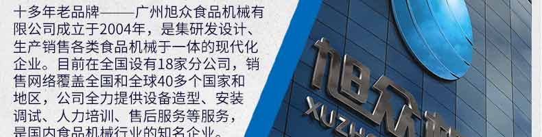 廣州旭眾食品機械有限公司是一家集科研開發(fā),生產(chǎn)設計,營銷服務為一體的現(xiàn)代化生產(chǎn)企業(yè)?,F(xiàn)代化生產(chǎn)車間,精湛制造技術(shù),所產(chǎn)機械歷經(jīng)市場重重考驗,不斷贏得海內(nèi)外客戶的贊譽。