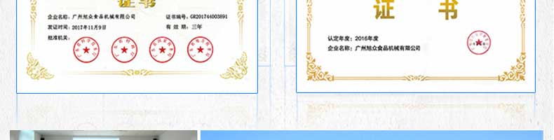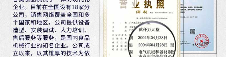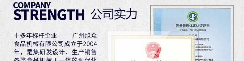 廣州旭眾食品機械有限公司是一家集科研開發(fā),生產(chǎn)設計,營銷服務為一體的現(xiàn)代化生產(chǎn)企業(yè)?,F(xiàn)代化生產(chǎn)車間,精湛制造技術,所產(chǎn)機械歷經(jīng)市場重重考驗,不斷贏得海內(nèi)外客戶的贊譽。