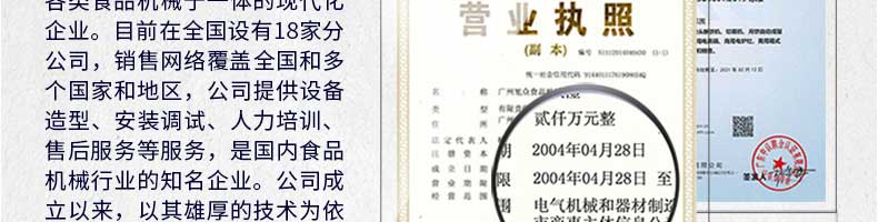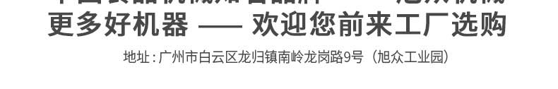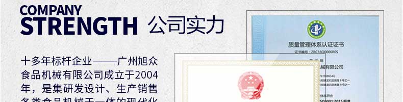 廣州旭眾食品機械有限公司是一家集科研開發(fā),生產(chǎn)設計,營銷服務為一體的現(xiàn)代化生產(chǎn)企業(yè)?,F(xiàn)代化生產(chǎn)車間,精湛制造技術,所產(chǎn)機械歷經(jīng)市場重重考驗,不斷贏得海內(nèi)外客戶的贊譽。