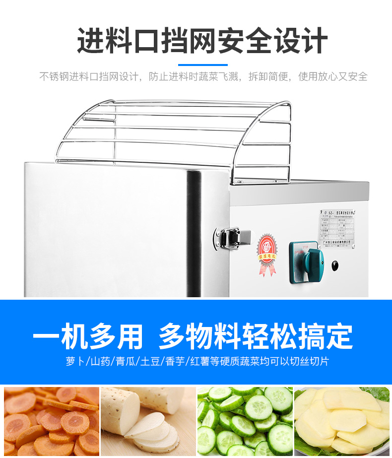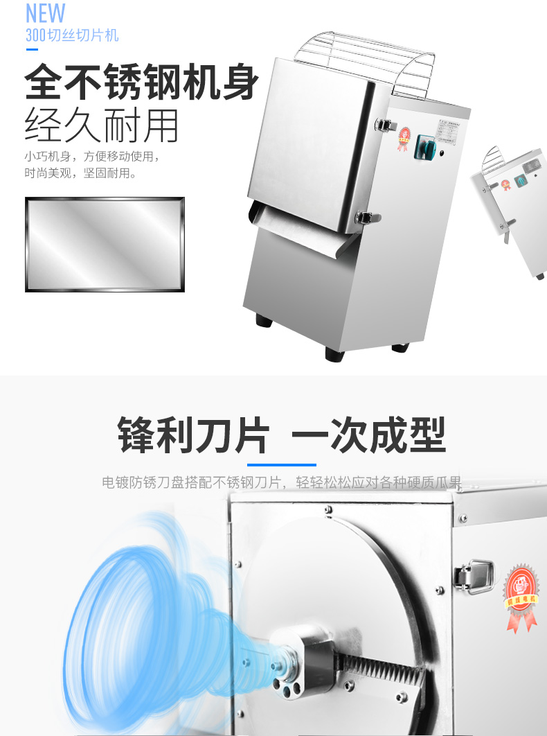 300型瓜果切絲切片機(jī),高效便捷、一次成型、每小時可切200-300KG。全不銹鋼機(jī)身經(jīng)久耐用小巧機(jī)身,方便移動使用,時尚美觀,堅(jiān)固耐用。鋒利刀片、一次成型。電鍍防銹刀盤搭配不銹鋼刀片,輕輕松松應(yīng)對各種硬質(zhì)瓜果。