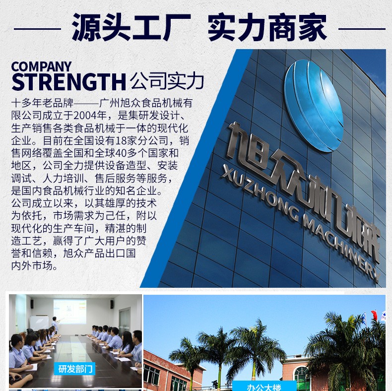 廣州旭眾食品機(jī)械有限公司是一家集科研開發(fā),生產(chǎn)設(shè)計(jì),營銷服務(wù)為一體的現(xiàn)代化生產(chǎn)企業(yè)。現(xiàn)代化生產(chǎn)車間,精湛制造技術(shù),所產(chǎn)機(jī)械歷經(jīng)市場重重考驗(yàn),不斷贏得海內(nèi)外客戶的贊譽(yù)。