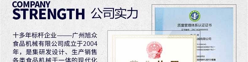 廣州旭眾食品機械有限公司是一家集科研開發(fā),生產(chǎn)設(shè)計,營銷服務(wù)為一體的現(xiàn)代化生產(chǎn)企業(yè)。現(xiàn)代化生產(chǎn)車間,精湛制造技術(shù),所產(chǎn)機械歷經(jīng)市場重重考驗,不斷贏得海內(nèi)外客戶的贊譽。