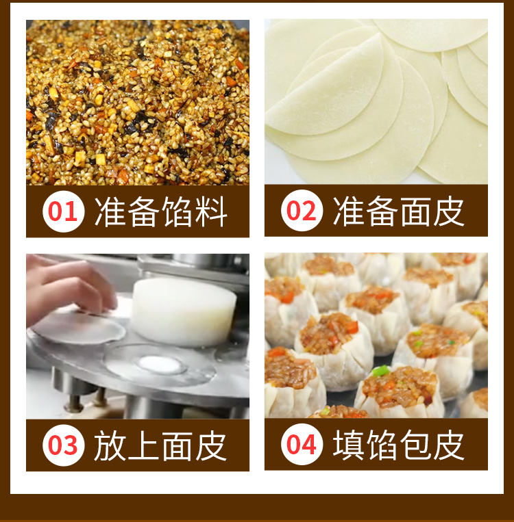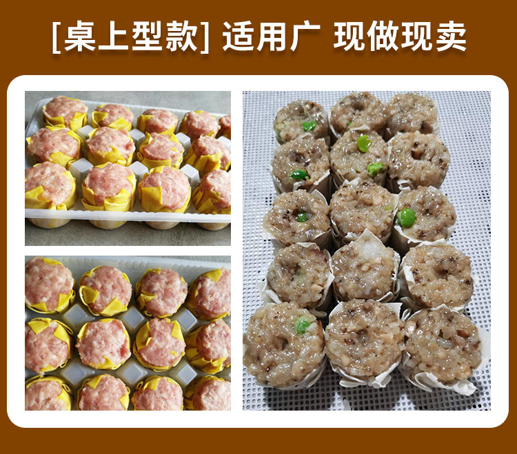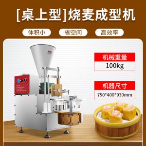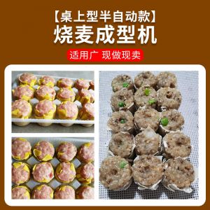 JGB-600燒麥機(jī),自動填餡包皮功能:臺式半自動單聯(lián)式燒麥成型機(jī),可以使用手工燒麥皮配合機(jī)器生產(chǎn)燒賣,其面皮口感好,產(chǎn)品外形美觀。餡料多與少可調(diào)節(jié)高效率1800個小時