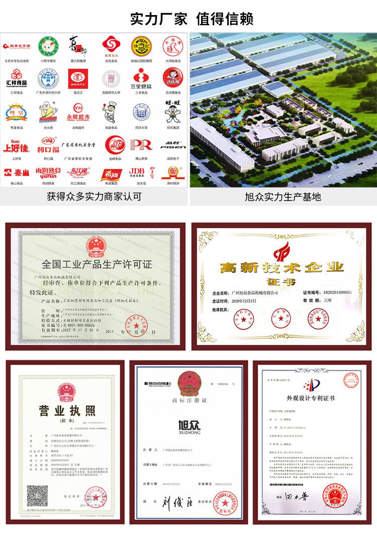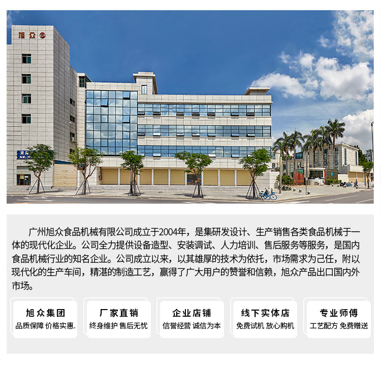 廣州旭眾食品機(jī)械有限公司是一家集科研開發(fā),生產(chǎn)設(shè)計,營銷服務(wù)為一體的現(xiàn)代化生產(chǎn)企業(yè)?,F(xiàn)代化生產(chǎn)車間,精湛制造技術(shù),所產(chǎn)機(jī)械歷經(jīng)市場重重考驗,不斷贏得海內(nèi)外客戶的贊譽(yù)。
