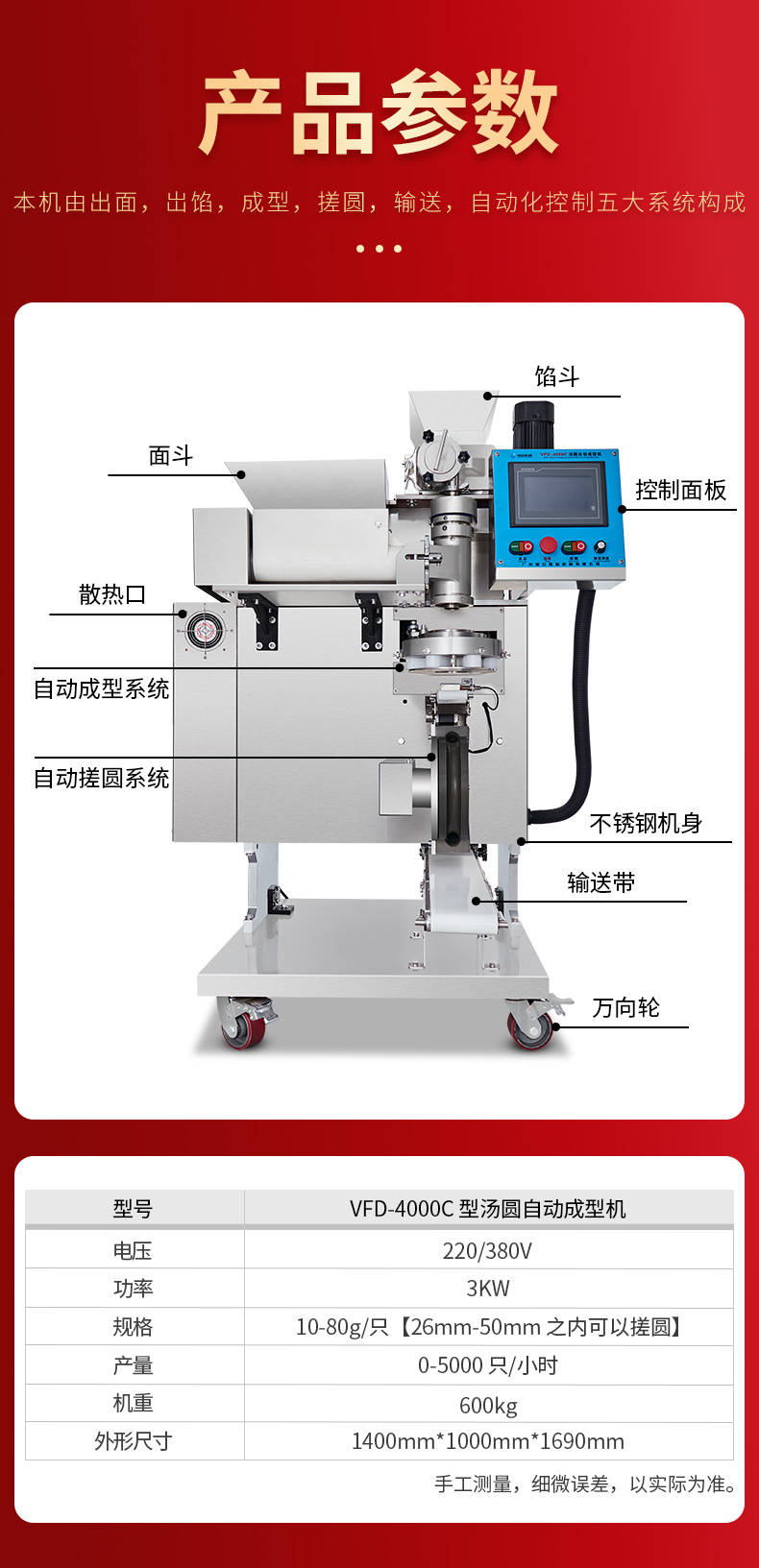 VFD-4000型湯圓自動成型排盤一體機,本機依外皮及餡料的種類不同,可制作湯圓、豆沙包、南瓜餅、奶黃包、含餡饅頭、玉兔包等包餡食品的設備。工作效率高、相當于8-12個工人同時制作湯圓,真正低收入、高收效、省錢省工。適合用于各種工作場所。免費上門安裝,贈送工藝
