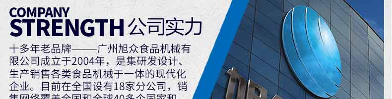 廣州旭眾食品機(jī)械有限公司是一家集科研開發(fā),生產(chǎn)設(shè)計(jì),營銷服務(wù)為一體的現(xiàn)代化生產(chǎn)企業(yè)。現(xiàn)代化生產(chǎn)車間,精湛制造技術(shù),所產(chǎn)機(jī)械歷經(jīng)市場重重考驗(yàn),不斷贏得海內(nèi)外客戶的贊譽(yù)。