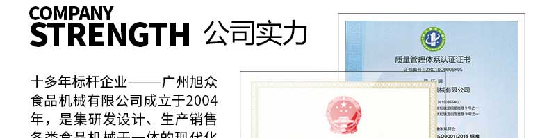 廣州旭眾食品機(jī)械有限公司是一家集科研開(kāi)發(fā),生產(chǎn)設(shè)計(jì),營(yíng)銷服務(wù)為一體的現(xiàn)代化生產(chǎn)企業(yè)。現(xiàn)代化生產(chǎn)車間,精湛制造技術(shù),所產(chǎn)機(jī)械歷經(jīng)市場(chǎng)重重考驗(yàn),不斷贏得海內(nèi)外客戶的贊譽(yù)。