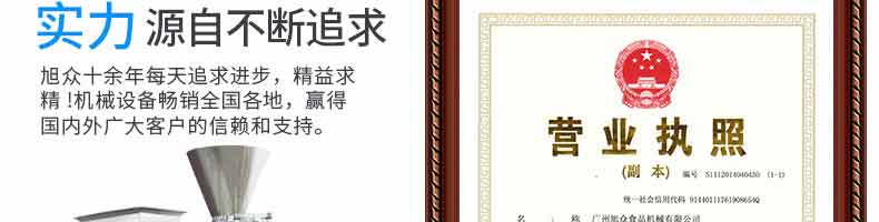 廣州旭眾食品機(jī)械有限公司是一家集科研開發(fā),生產(chǎn)設(shè)計,營銷服務(wù)為一體的現(xiàn)代化生產(chǎn)企業(yè)?,F(xiàn)代化生產(chǎn)車間,精湛制造技術(shù),所產(chǎn)機(jī)械歷經(jīng)市場重重考驗(yàn),不斷贏得海內(nèi)外客戶的贊譽(yù)。