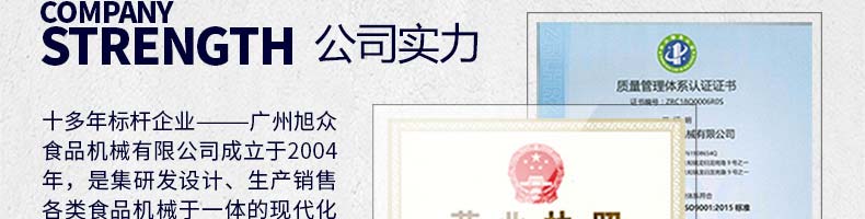 廣州旭眾食品機械有限公司是一家集科研開發(fā),生產(chǎn)設(shè)計,營銷服務(wù)為一體的現(xiàn)代化生產(chǎn)企業(yè)。現(xiàn)代化生產(chǎn)車間,精湛制造技術(shù),所產(chǎn)機械歷經(jīng)市場重重考驗,不斷贏得海內(nèi)外客戶的贊譽。