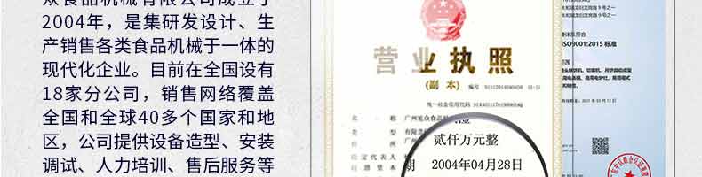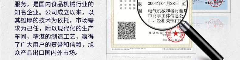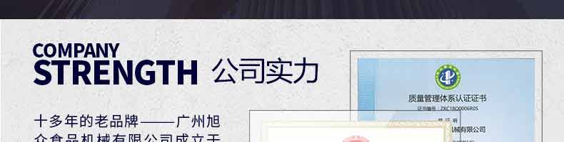 廣州旭眾食品機(jī)械有限公司是一家集科研開(kāi)發(fā),生產(chǎn)設(shè)計(jì),營(yíng)銷服務(wù)為一體的現(xiàn)代化生產(chǎn)企業(yè)?,F(xiàn)代化生產(chǎn)車間,精湛制造技術(shù),所產(chǎn)機(jī)械歷經(jīng)市場(chǎng)重重考驗(yàn),不斷贏得海內(nèi)外客戶的贊譽(yù)。