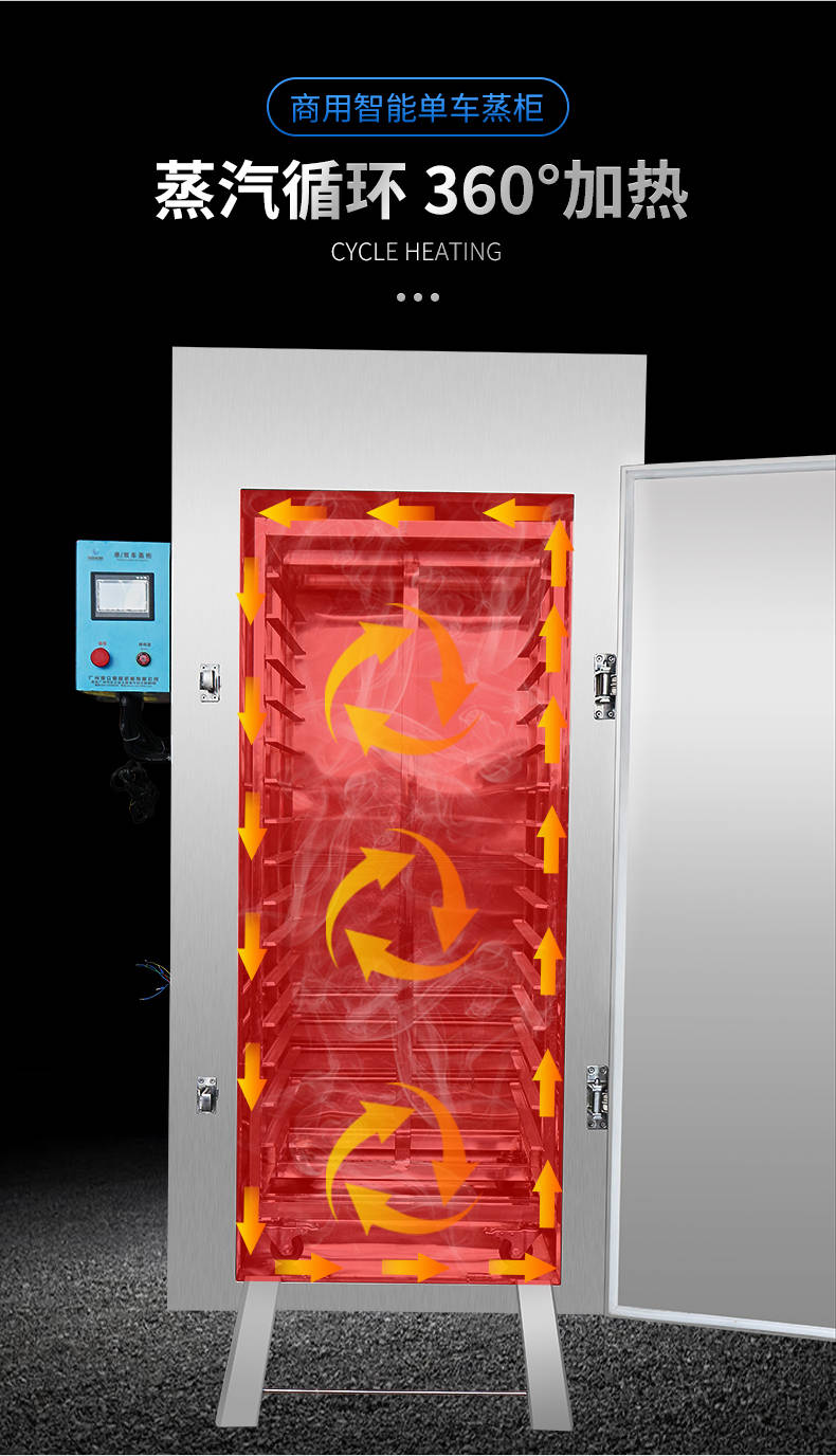單車蒸柜,整機(jī)不銹鋼材質(zhì)本機(jī)由內(nèi)膽殼、保溫層、外護(hù)板組成,整機(jī)采用優(yōu)質(zhì)不銹鋼,加上硅膠密封及硅酸鋁保溫材料,堅(jiān)固、耐用、保溫效果好,外形美觀。循環(huán)均勻發(fā)熱,專門用于發(fā)熱管干燒空氣,溫度任意調(diào)節(jié),讓食物口感怡到好吃