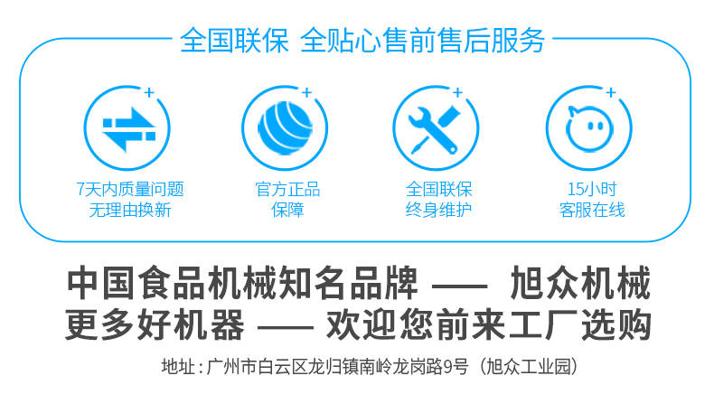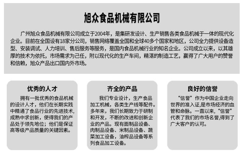 廣州旭眾食品機(jī)械有限公司是一家集科研開(kāi)發(fā),生產(chǎn)設(shè)計(jì),營(yíng)銷服務(wù)為一體的現(xiàn)代化生產(chǎn)企業(yè)?,F(xiàn)代化生產(chǎn)車間,精湛制造技術(shù),所產(chǎn)機(jī)械歷經(jīng)市場(chǎng)重重考驗(yàn),不斷贏得海內(nèi)外客戶的贊譽(yù)。