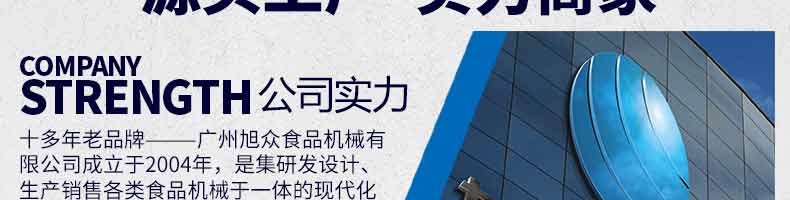 廣州旭眾食品機械有限公司是一家集科研開發(fā),生產(chǎn)設(shè)計,營銷服務(wù)為一體的現(xiàn)代化生產(chǎn)企業(yè)。現(xiàn)代化生產(chǎn)車間,精湛制造技術(shù),所產(chǎn)機械歷經(jīng)市場重重考驗,不斷贏得海內(nèi)外客戶的贊譽。